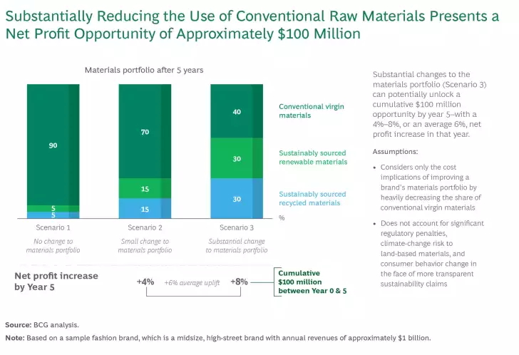 Brands must drive carbon reduction and prepare for upcoming regulations. They need a robust strategy for preferred raw materials—one that helps them lock in a supply of sustainable materials for the future. Putting that strategy in place—and into immediate action—promises to pay off. Brands that act now to secure a preferred-raw-materials supply for the future will be positioned to capture an estimated average 6% profit uplift after five years. In fact, at the high end of the range in our model, a fashion brand with $1 billion in annual revenues has the potential to tap a cumulative opportunity of approximately $100 million over five years.